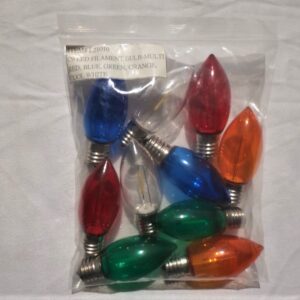 Our LED C-9 Multi-Color Bulbs have been custom designed made specifically for our Luminarias. The come with 2 Red, 2 Blue, 2 Green, 2 Orange, and 2 Cool White Bulbs for a total of 10 bulbs. They are the brightest bulbs that make sure to light up thru your luminarias bags. These are definitely not the type of LED light bulbs that you buy at a big box retail store unless its our bulbs. These bulbs look great with our Die-Cut White Starburst Sleeves (L10093), White Die-Cut Stars and Moons Sleeves (L10250), or White Sleeves (L21006).