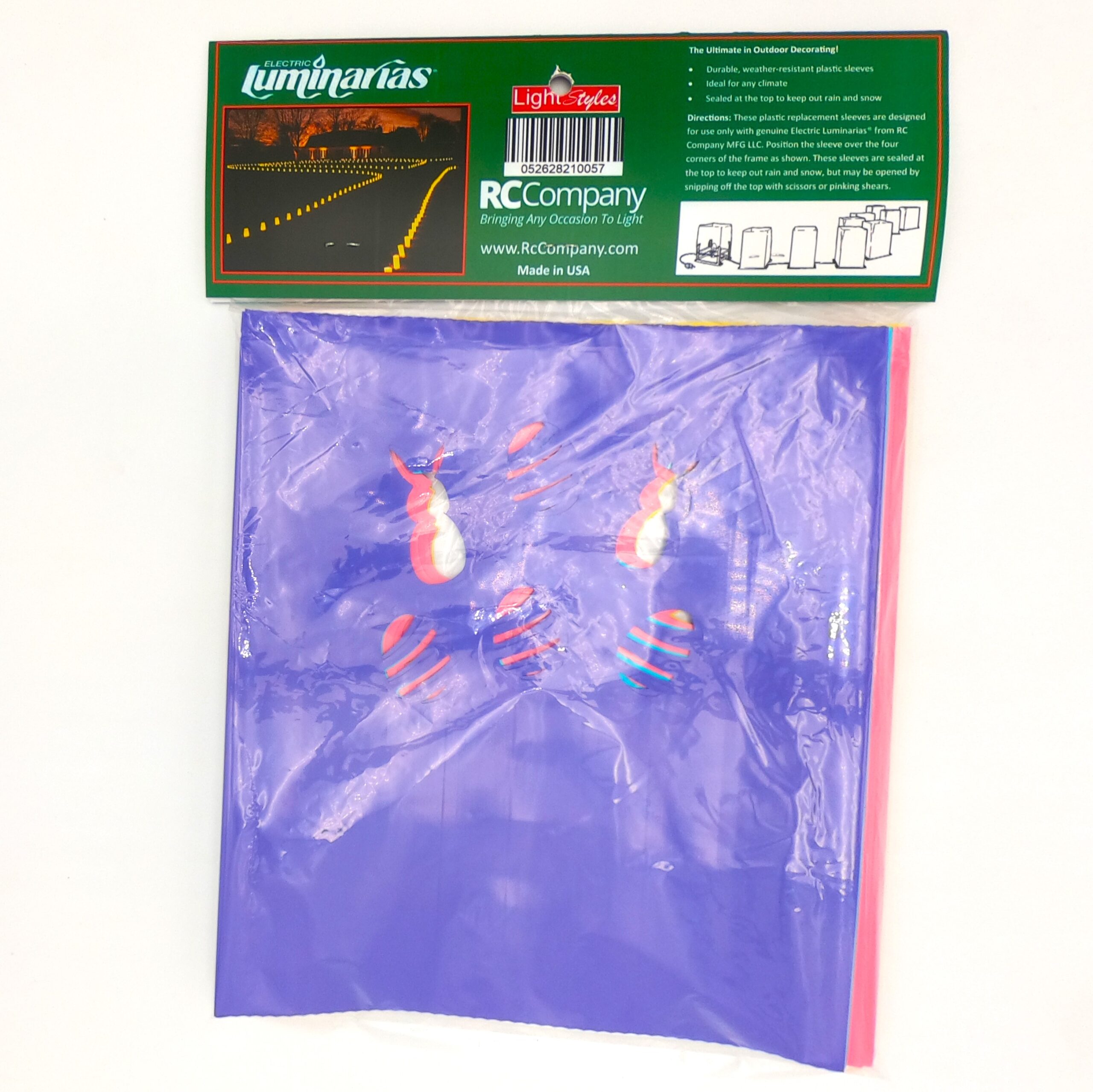 Luminarias are a Spanish tradition originally using a brown paper bag with sand in the bottom and a candle. They were used to light sidewalks and pathways on Christmas Eve. Some say the original name was farolitos. RC Company manufactures Electric Luminarias. Our complete set includes a 30 ft cord with 10 Luminarias spaced every 3 feet. We offer various colored sleeves or bags for your holiday decorating and special events. Our sleeves are sold sealed at the top but may be cut if you prefer more of a bag look. See photo for variation.