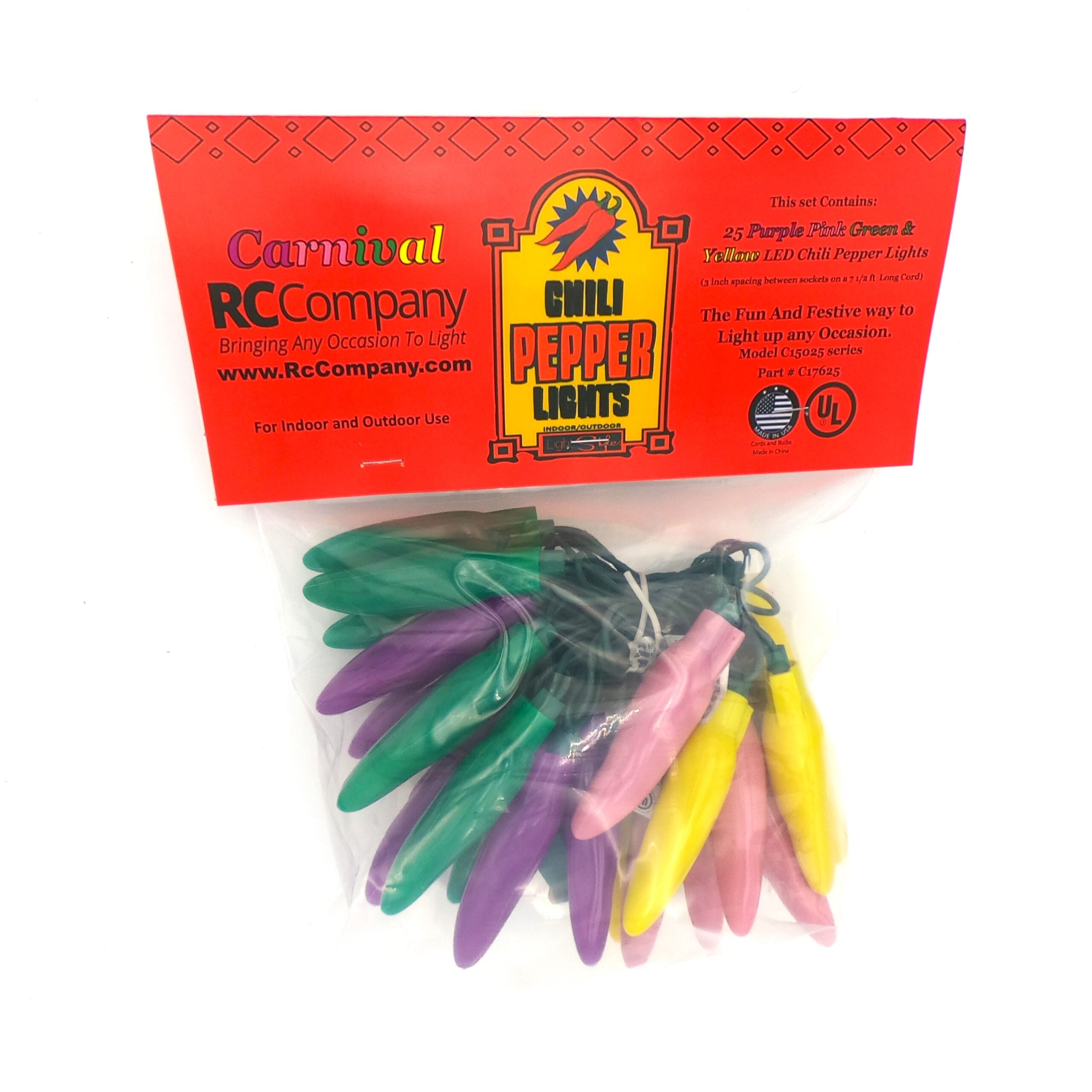 25 LED Carnival Purple, Pink, Green, & Yellow Chili Pepper Lights (25 Lights, 7 1/2-ft. Long, 3 inch spacing between lights, Each Chili’s measurement is 3 inches long by 3/4 inch wide)