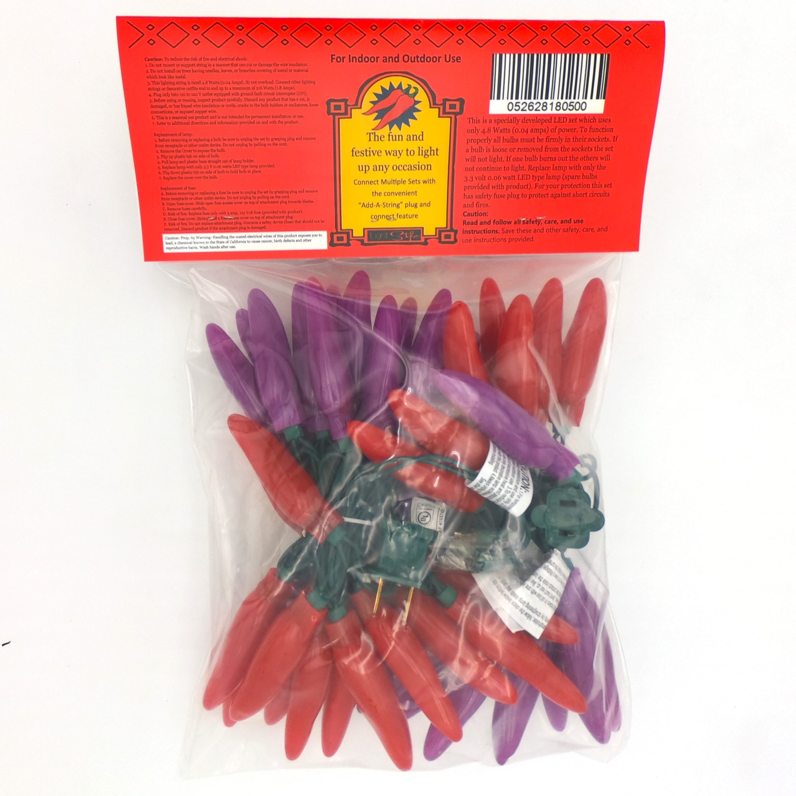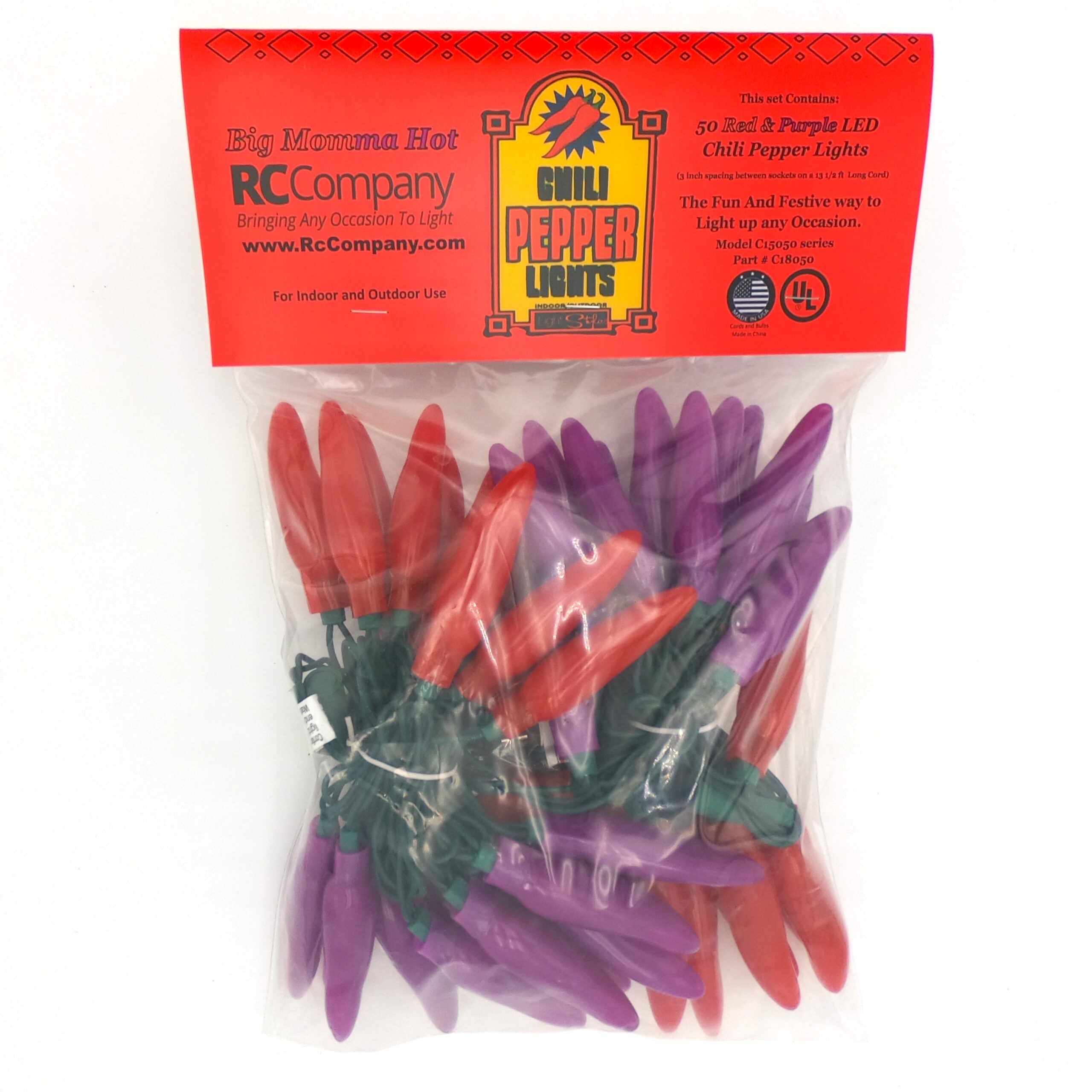 50 LED Big Momma Hot Red & Purple Chili Pepper Lights (50 Lights, 13 1/2-ft. Long, 3 inch spacing between lights, Each Chili’s measurement is 3 inches long by 3/4 inch wide)