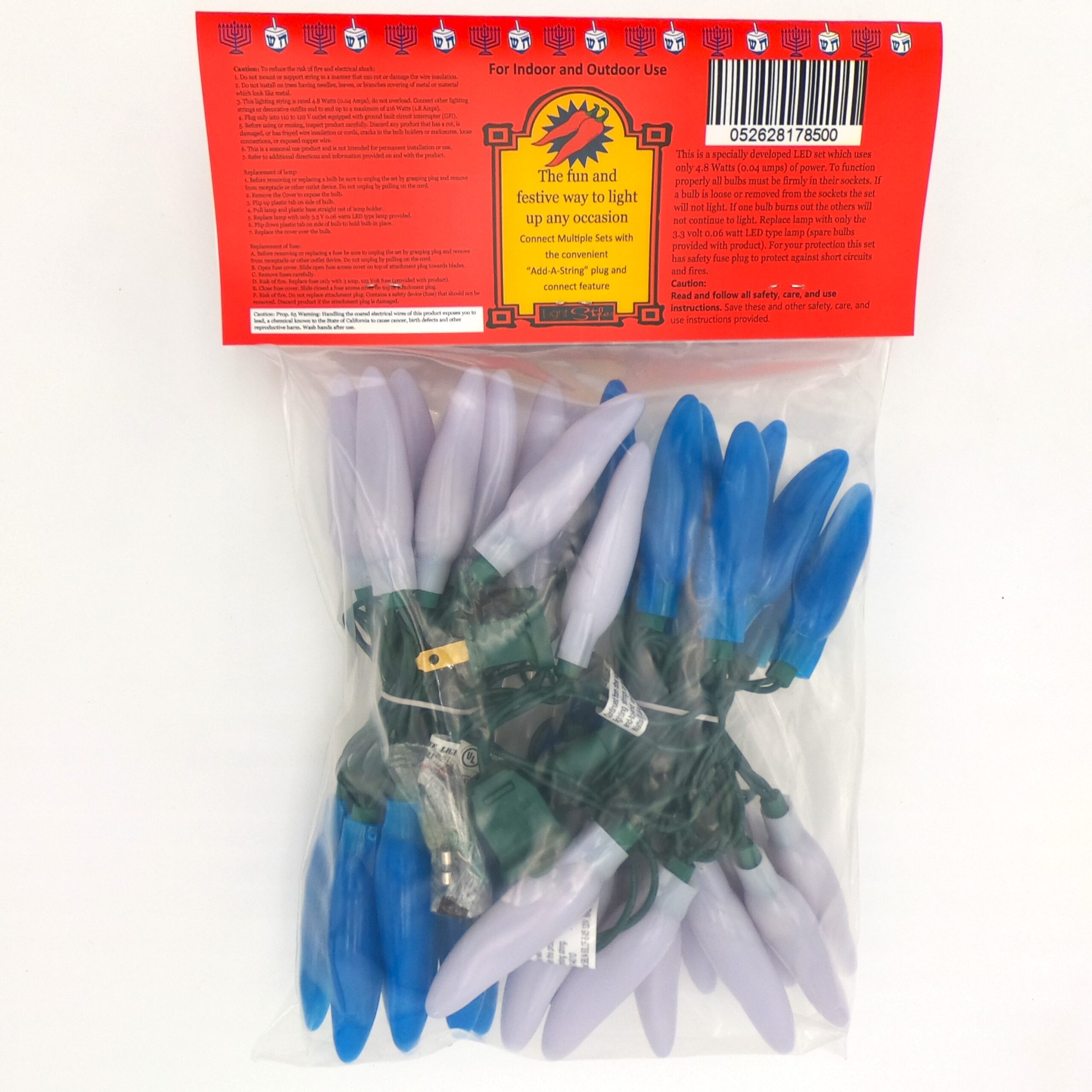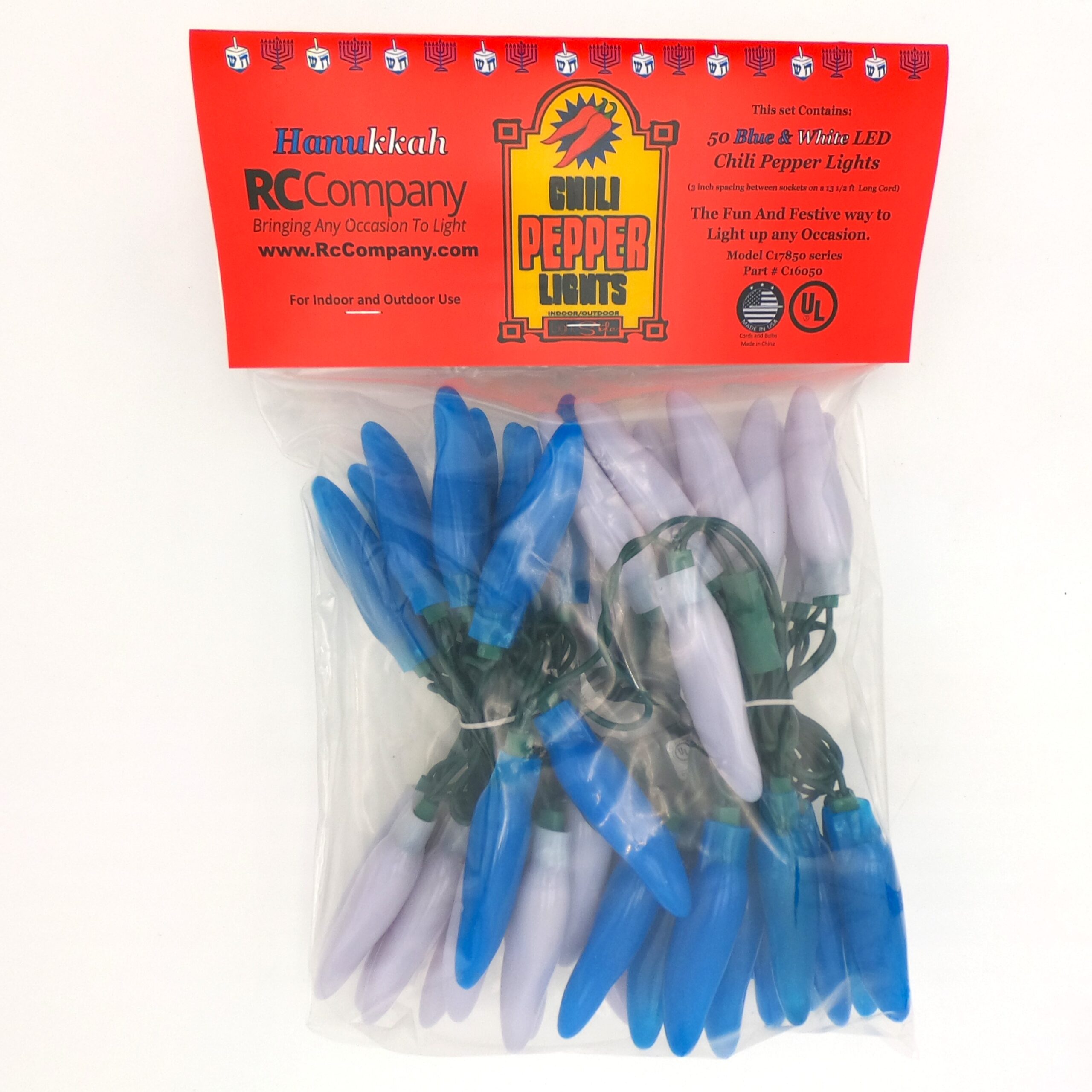 50 LED Hanukkah Blue & White Chili Pepper Lights (50 Lights, 13 1/2-ft. Long, 3 inch spacing between lights, Each Chili’s measurement is 3 inches long by 3/4 inch wide)