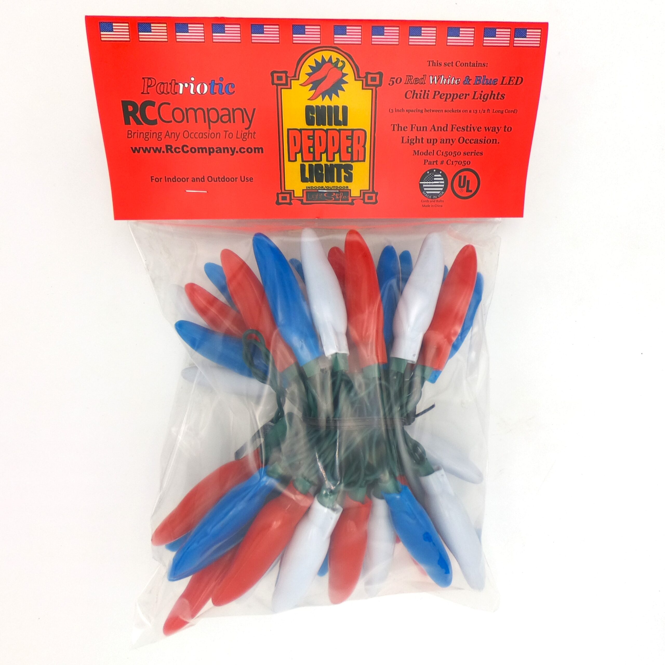 50 LED Patriotic Red, White, & Blue Chili Pepper Lights (50 Lights, 13 1/2-ft. Long, 3 inch spacing between lights, Each Chili’s measurement is 3 inches long by 3/4 inch wide)