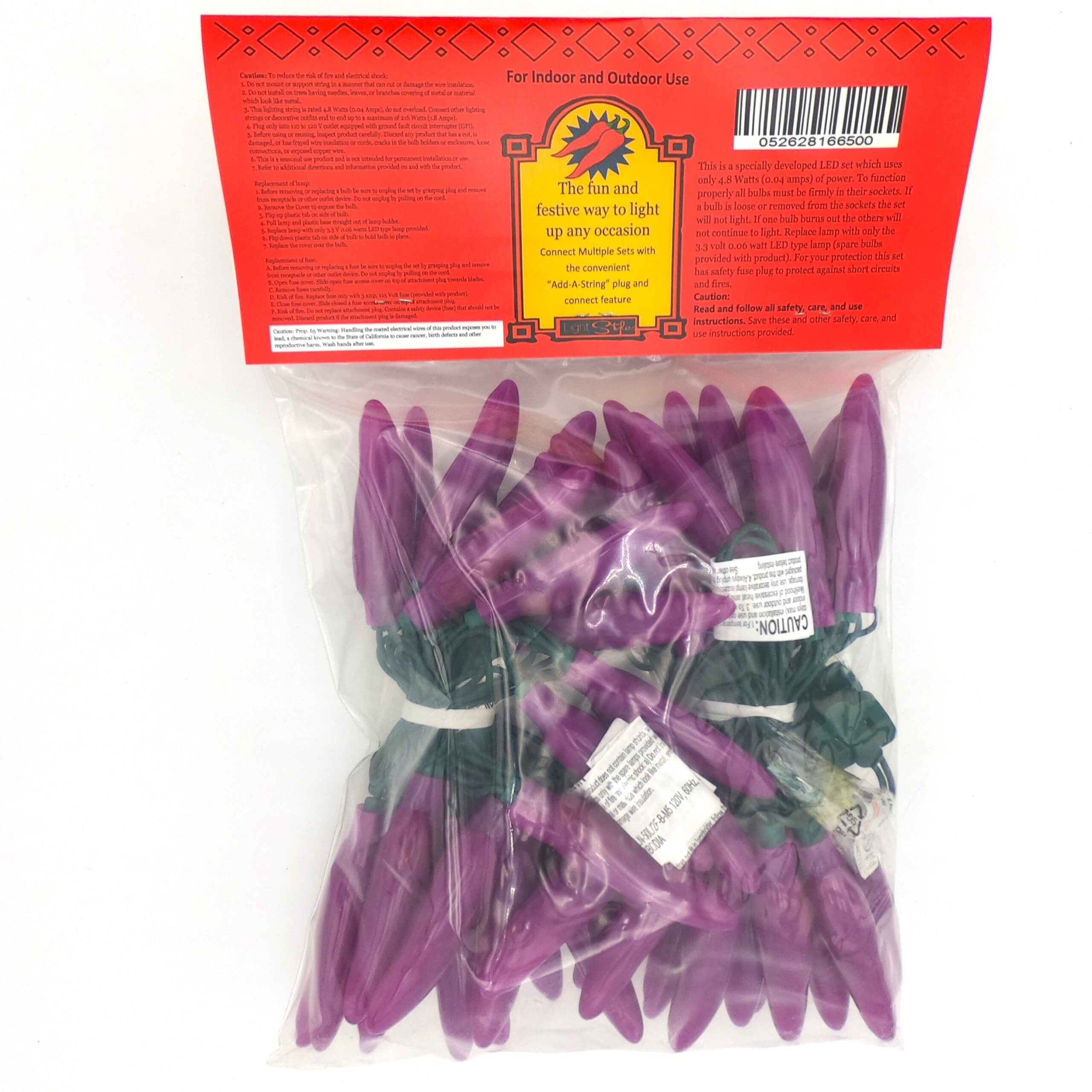 50 LED Purple Chili Pepper Lights (50 Lights, 13 1/2-ft. Long, 3 inch spacing between lights, Each Chili’s measurement is 3 inches long by 3/4 inch wide)