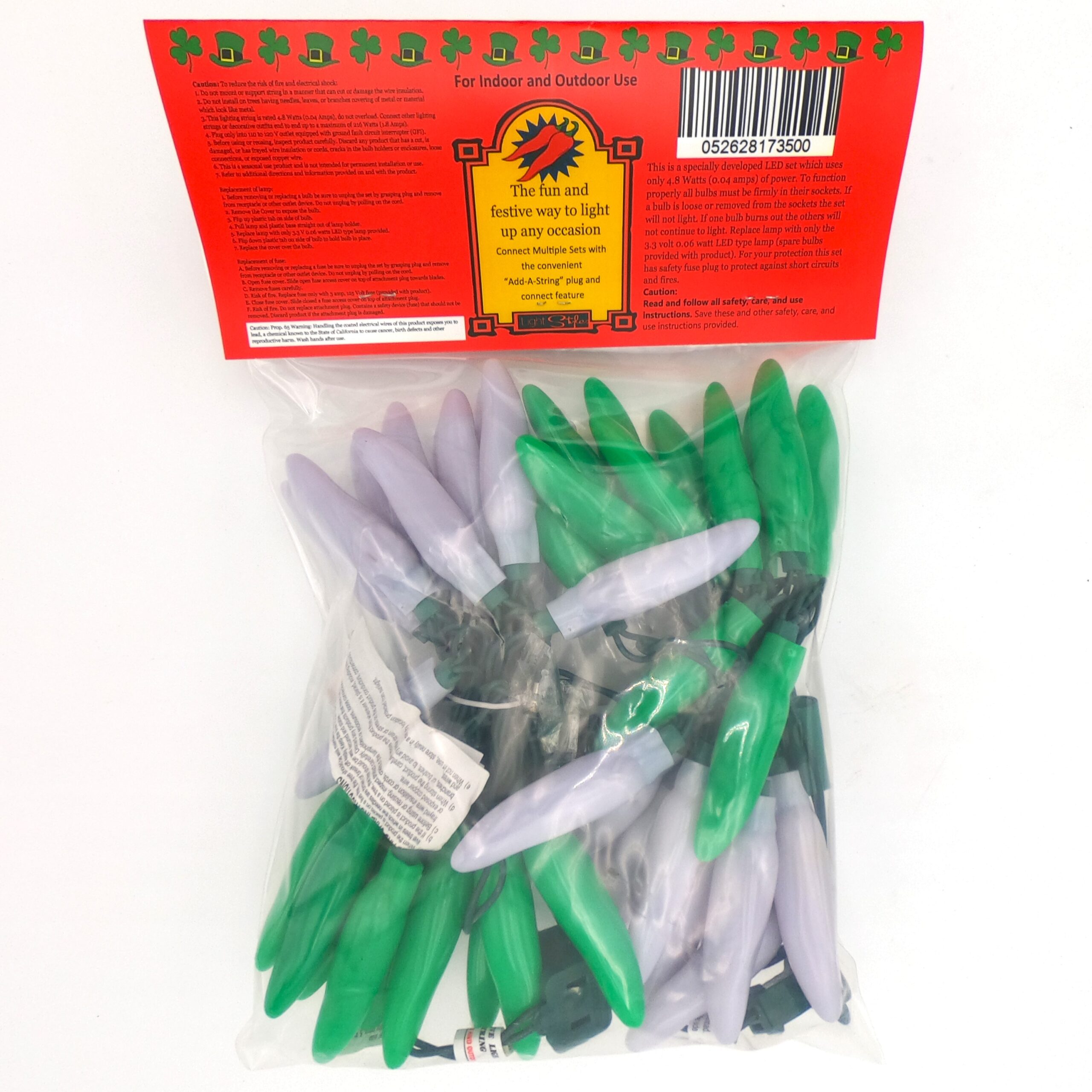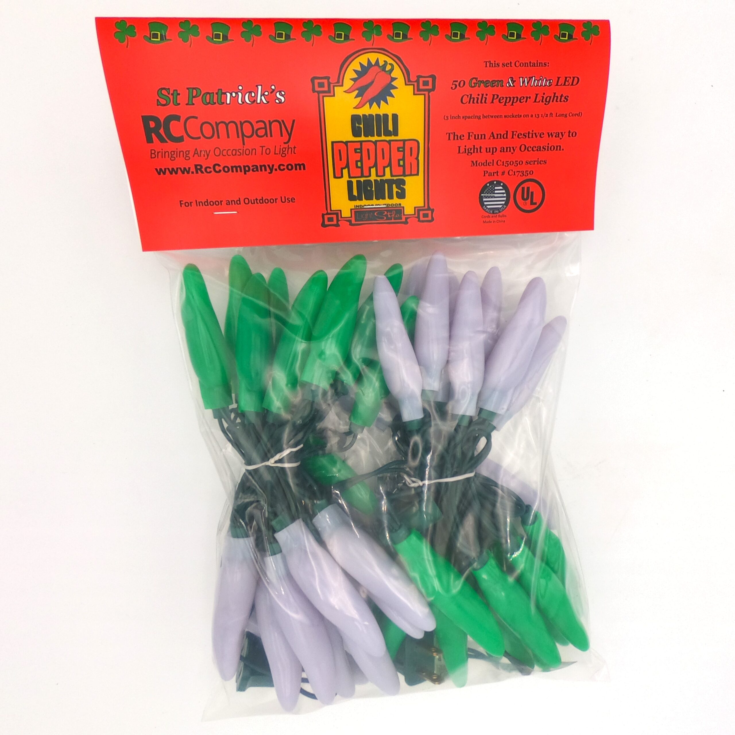 50 LED St Patrick’s Light Green & White Chili Pepper Lights (50 Lights, 13 1/2-ft. Long, 3 inch spacing between lights, Each Chili’s measurement is 3 inches long by 3/4 inch wide)